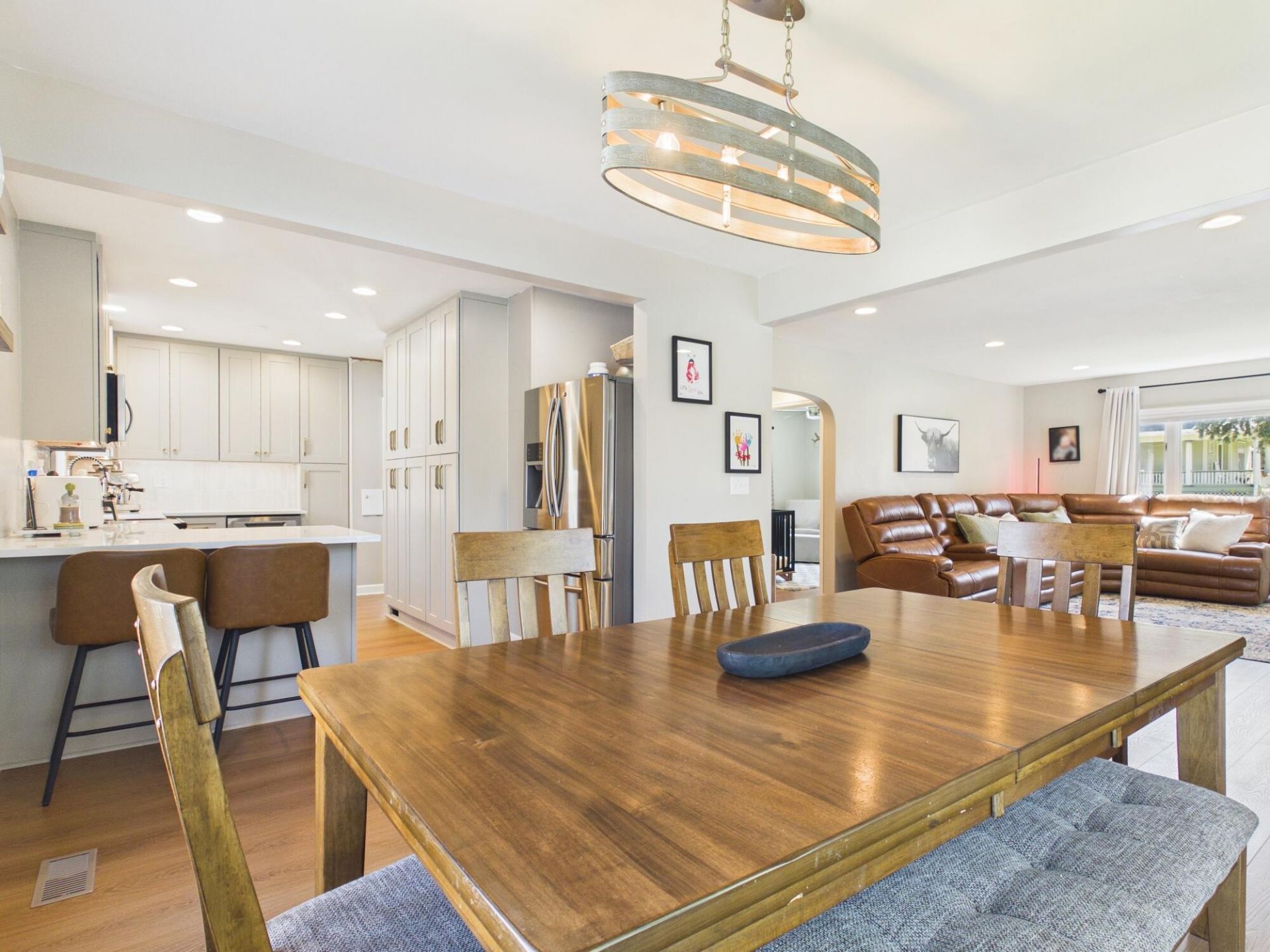 Beautifully updated 3 bed, 3 bath corner-lot home with a cohesive, high-end feel-Perfect for everyday living and entertaining. The renovated kitchen features quartz countertops, custom cabinetry, and modern finishes. LVP flooring spans the main level, with bamboo flooring continuing upstairs for a seamless flow. The main floor offers a bedroom and full bath, filled with natural light from a new east-facing window. Upstairs includes a renovated bathroom with an Onyx shower pan. The finished basement adds extra living space with a built-in table, bar seating, and dedicated space for a refrigerator and a versatile non-conforming room. Enjoy the composite deck and private vinyl-fenced yard. Detached 2-car garage with breezeway and extensive updates provide comfort and peace of mind.